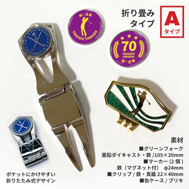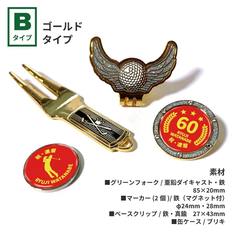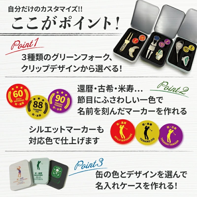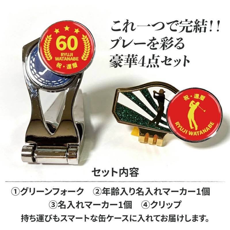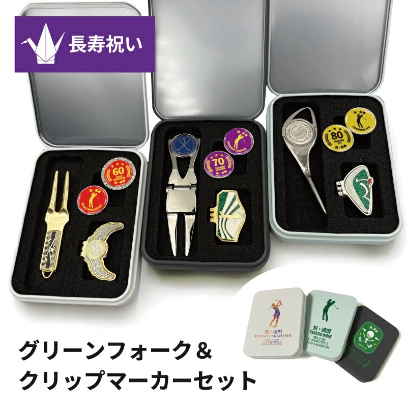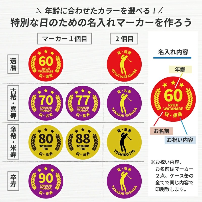 還暦・古希・喜寿・傘寿・米寿・卒寿など、それぞれのご長寿祝いに合わせた記念マーカーがセットになった特別仕様です。年齢ごとに色分けされたデザインは、お祝いの席でもひと目でわかりやすく、写真映えもする華やかさ。ゴルフを楽しまれる方への贈り物として、気持ちがしっかり伝わるアイテムです。
