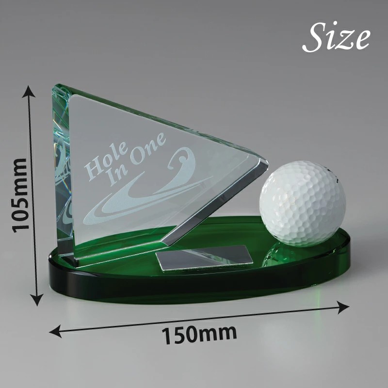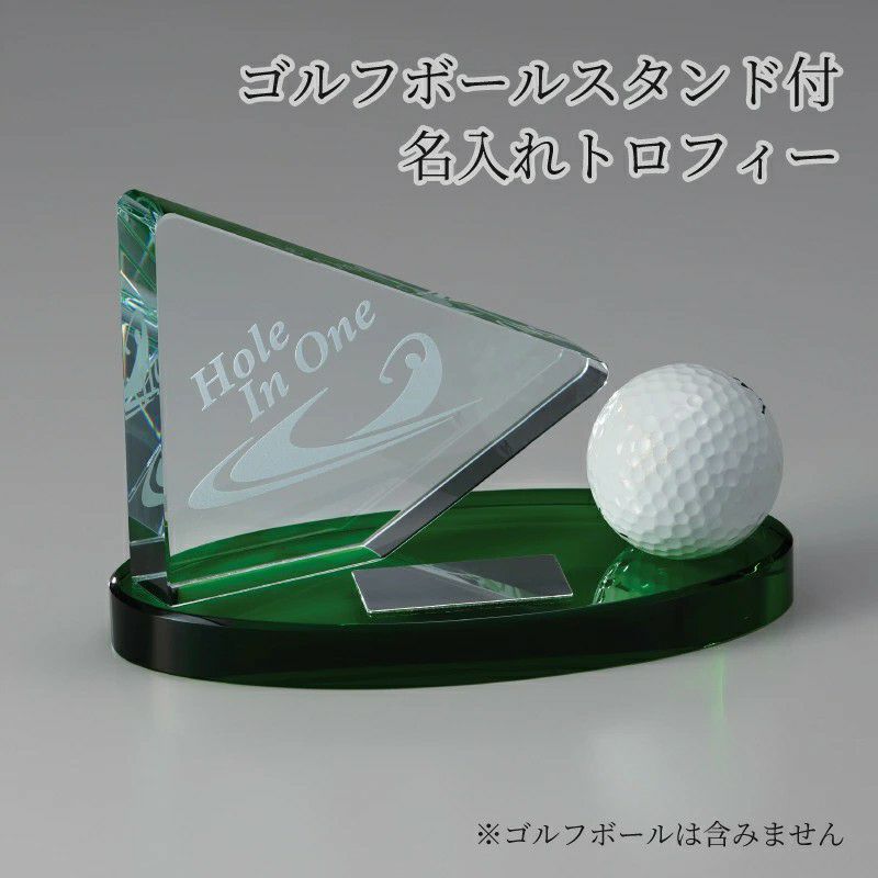 ホールインワンの記念球を載せて楽しめる、光学ガラス製の名入れトロフィーです。