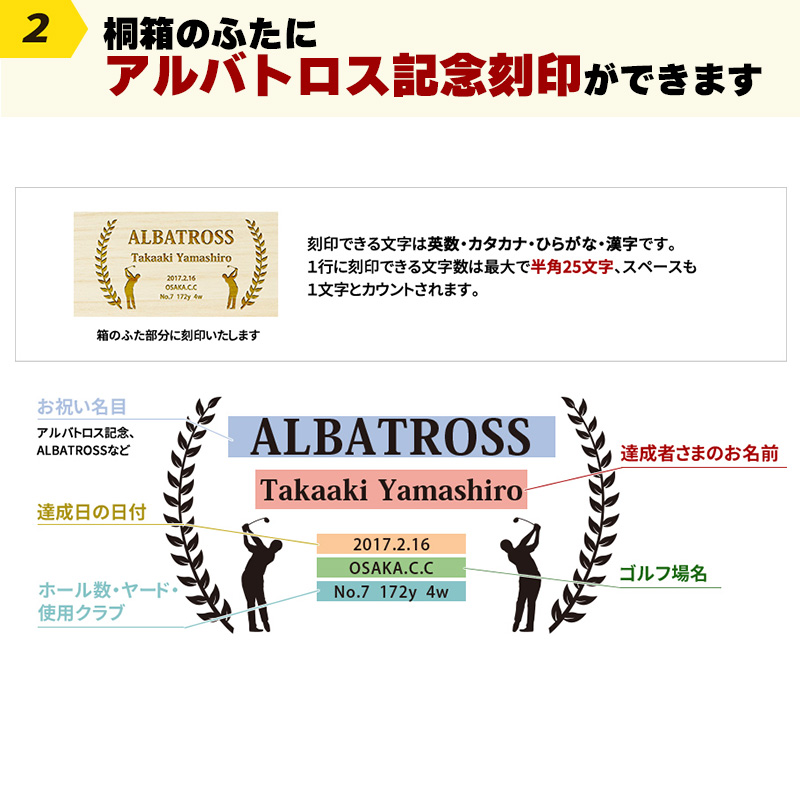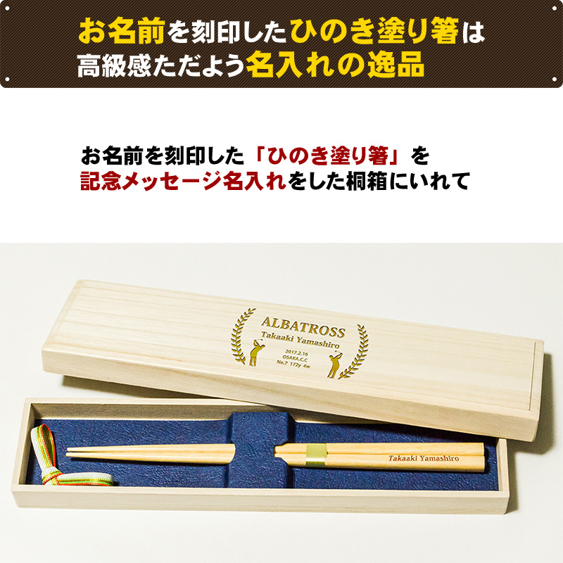 ちょっと変わったアルバトロスの記念品なら、お名前を刻印できる「ひのき塗箸」はいかが? 日本国内産のひのき素材、福井県若狭で素材感を活かすクリア塗りを施した「ひのき塗箸」にお名前を刻印して、オリジナルなアルバトロス記念品に。 記念メッセージを刻印した桐箱に入れることで、記念品としての高級感も演出。 喜んで頂けること間違いなしのアルバトロス記念品です。