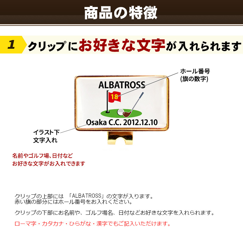 クリップ部分にはホールインワを達成されたホール番号や日付など、お好きな文字が入れられるので、使ってもらえるアルバトロス記念品として最適です。