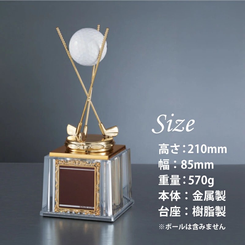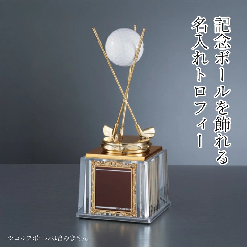ホールインワンやエイジシュート、アルバトロスなど特別な記録を形に残すための記念品。ボールを乗せて飾れるデザインで、達成時の思い出をそのまま演出できる。真鍮製のオブジェと木製台座を組み合わせた重厚感のある仕上がりで、台座部分には名入れ刻印が可能。お名前や記念日、達成内容を刻むことで、世界にひとつだけのゴルフ記念トロフィーとして長く飾れる一品。