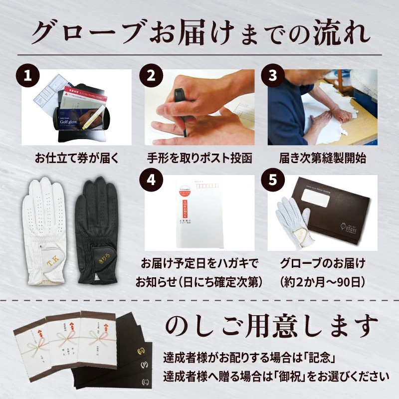 (※お手型を採寸してからゴルフグローブをお作りしますので、最初に送られてくるお仕立て券ギフトにはゴルフグローブは入っていません。) |