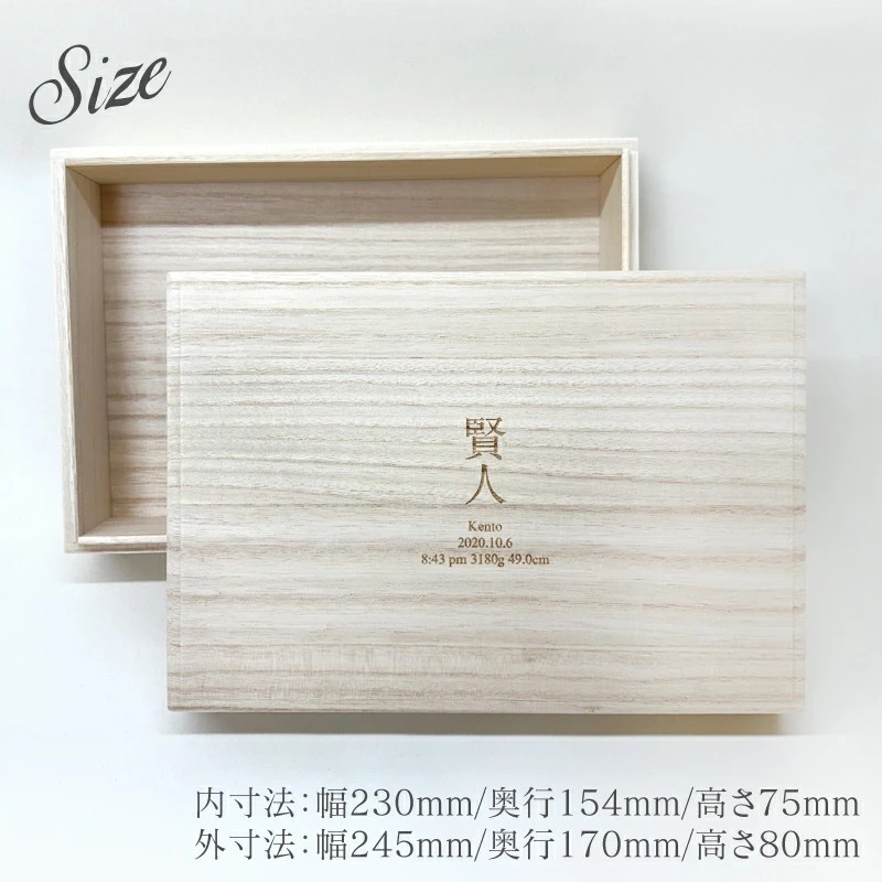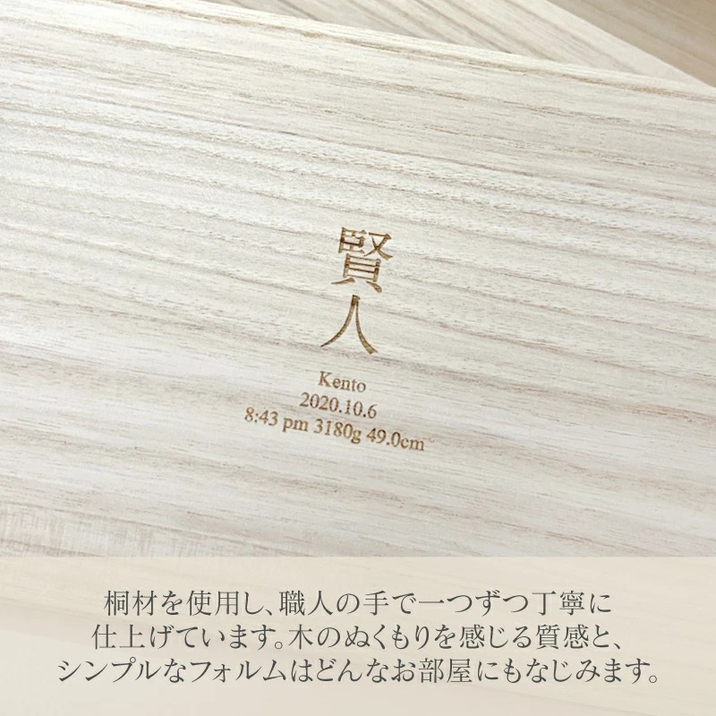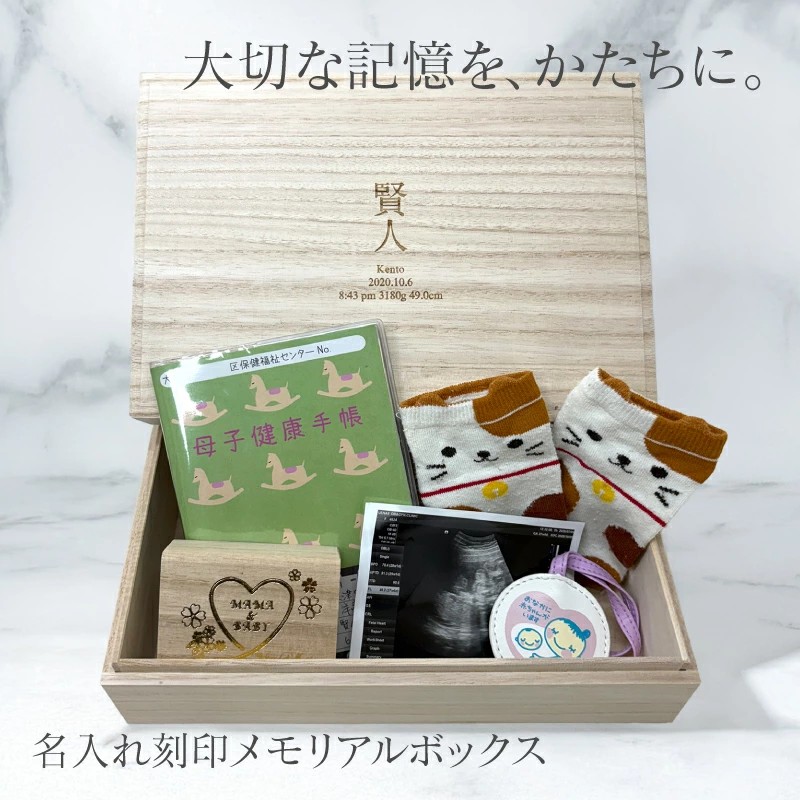 世界にひとつだけの、想いを刻む特別な記念ボックス。 赤ちゃんの「お名前・誕生日・出生時間・身長・体重」を刻印できる、オリジナルのメモリアルボックスです。 日本製の桐箱を使用し、しっかりとした作りで大切な記録や思い出を長く保管できます。 母子手帳やエコー写真、へその緒、ファーストシューズなど、成長の証をまとめて収納できるのも魅力。 出産祝い・誕生日祝い・記念日のギフトとしても喜ばれるアイテムです。 大切な思い出を「かたち」に残す、世界にひとつの宝箱をぜひ。