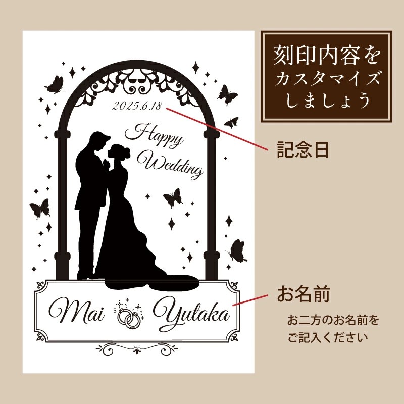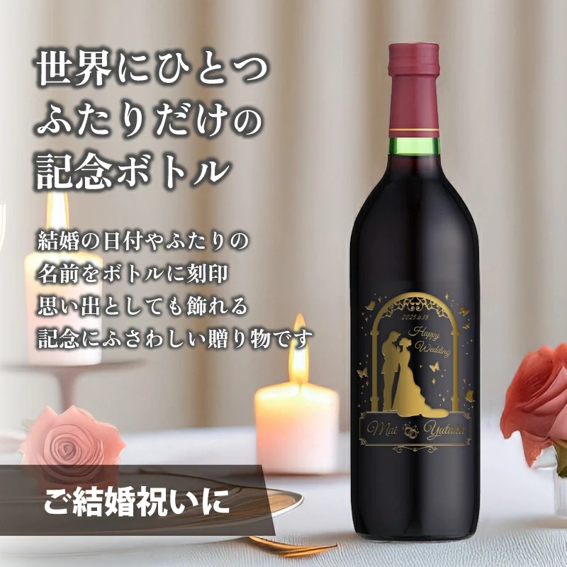 新郎新婦のお名前や日付を刻印できる、世界にひとつだけの名入れボトル。 金色のデザインが美しく映える高級感ある仕上がりで、 結婚祝い・記念日・ウェディングギフトにぴったりです。