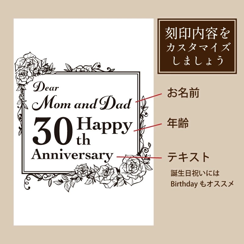 人生の節目を祝う、名入れアニバーサリーボトル 誕生日、還暦、退職祝い、達成記念など、 人生の中で何度も訪れるわけではない、大切な節目のために。 このアニバーサリーボトルは、想いを形として残すための特別なお酒ギフトです。 お名前や記念日、メッセージを一本一本丁寧に刻印し、 その人だけの物語を宿した、世界にひとつのボトルに仕上げます。 手にした瞬間から特別感が伝わり、贈る側の気持ちまで美しく届けます。 お酒として味わう時間はもちろん、 飲み終えたあとも記念品として飾ることができ、 その節目を迎えた日の記憶を、静かに語り続けてくれる存在に。 人生を重ねてきた証を称え、 これからの歩みに想いを添える—— そんな贈り物として選ばれています。