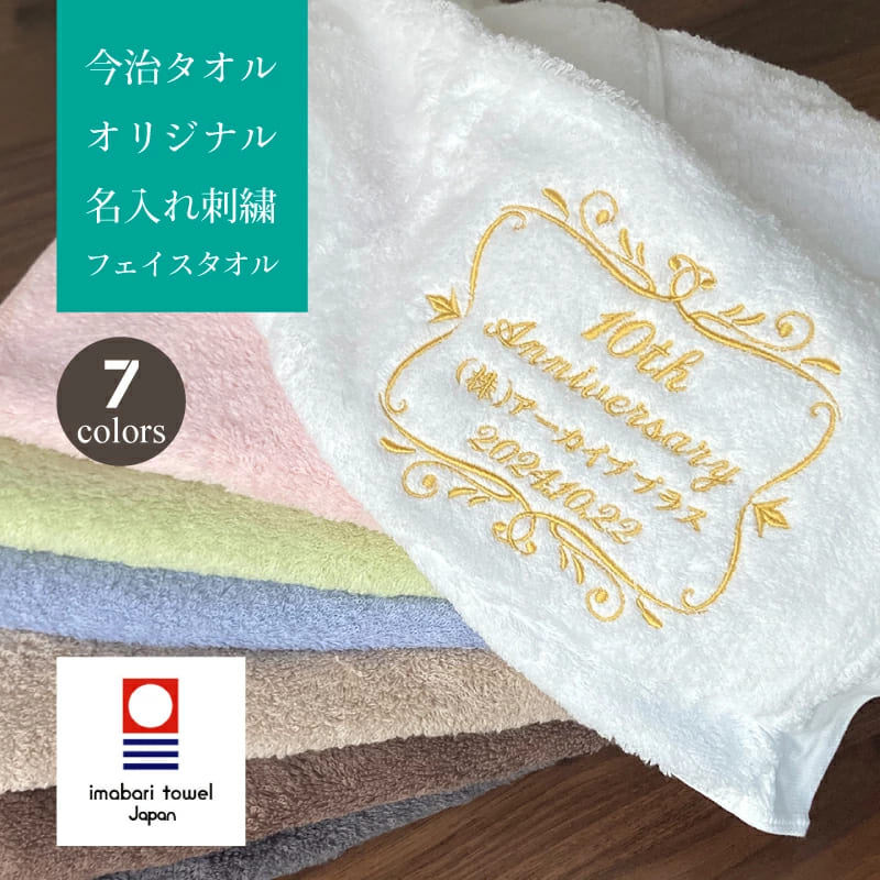国産の人気タオル、今治ブランドタオルを使用した 名入れ刺繍フェイスタオルです。 なめらかでやさしい肌触り。 会社、サークル、店舗の周年記念、コンペのギフトに